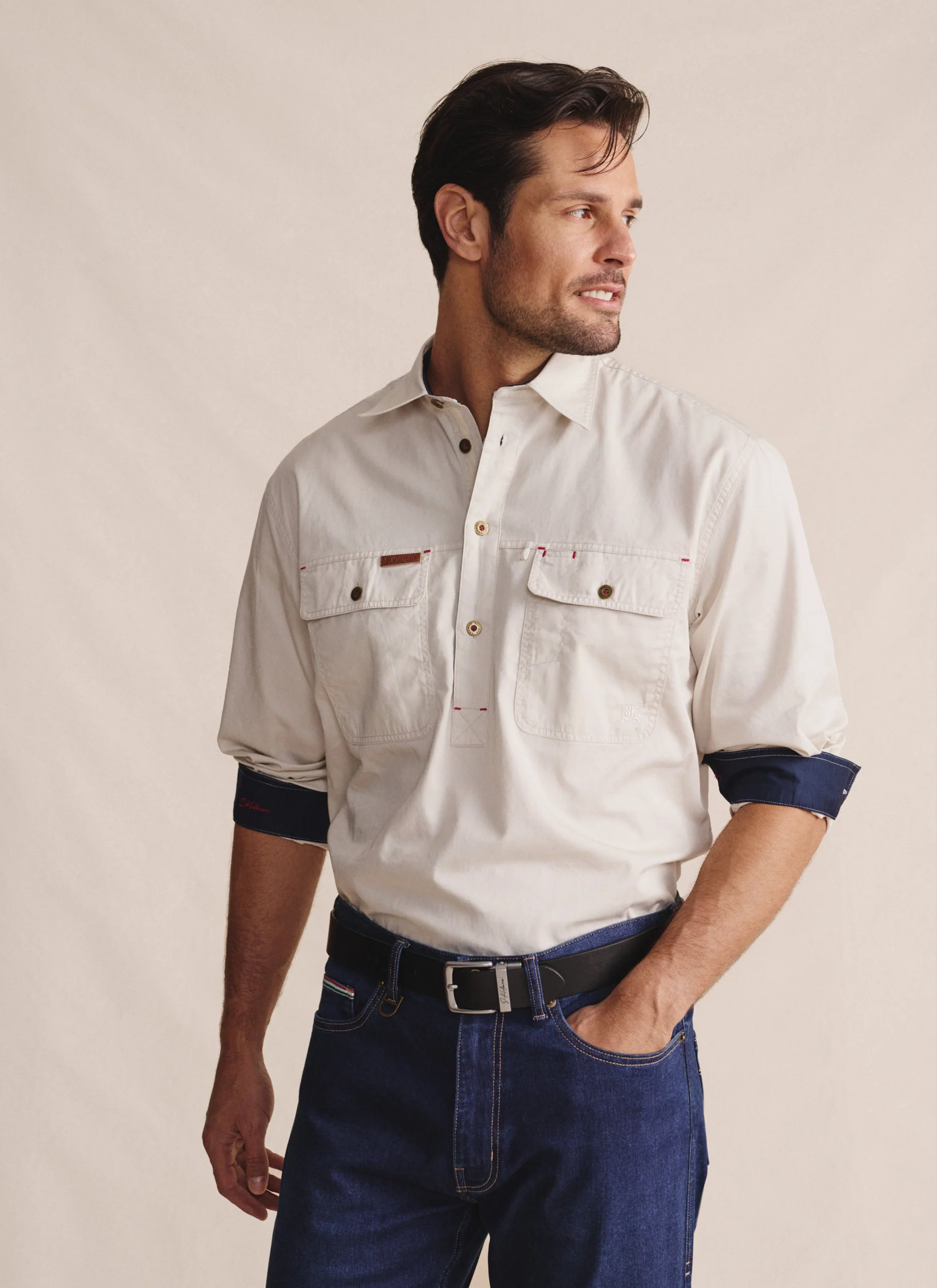 The Brockman lightweight half placket work shirt is for those who don’t shy away from anything, especially getting the job done. Stand out in this 100% Australilan cotton twill, UPF50+ work shirt. Reinforced double-stitched seams, extra-large front pockets and heavy-duty metal buttons stitched in S.Kidman red ensure lasting strength. Finished with 100% cotton stripe tape reinforcements. It’s made to work as hard as you do.
