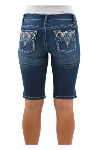 Stretch for comfort, mid rise, sits above knee, logo shank button, diamante rivets, woven logo badge on back yoke, PW embroidery on coin pocket, turn up cuff, feature embroidery on back pockets and front scoop pockets, contrast all over topstitch