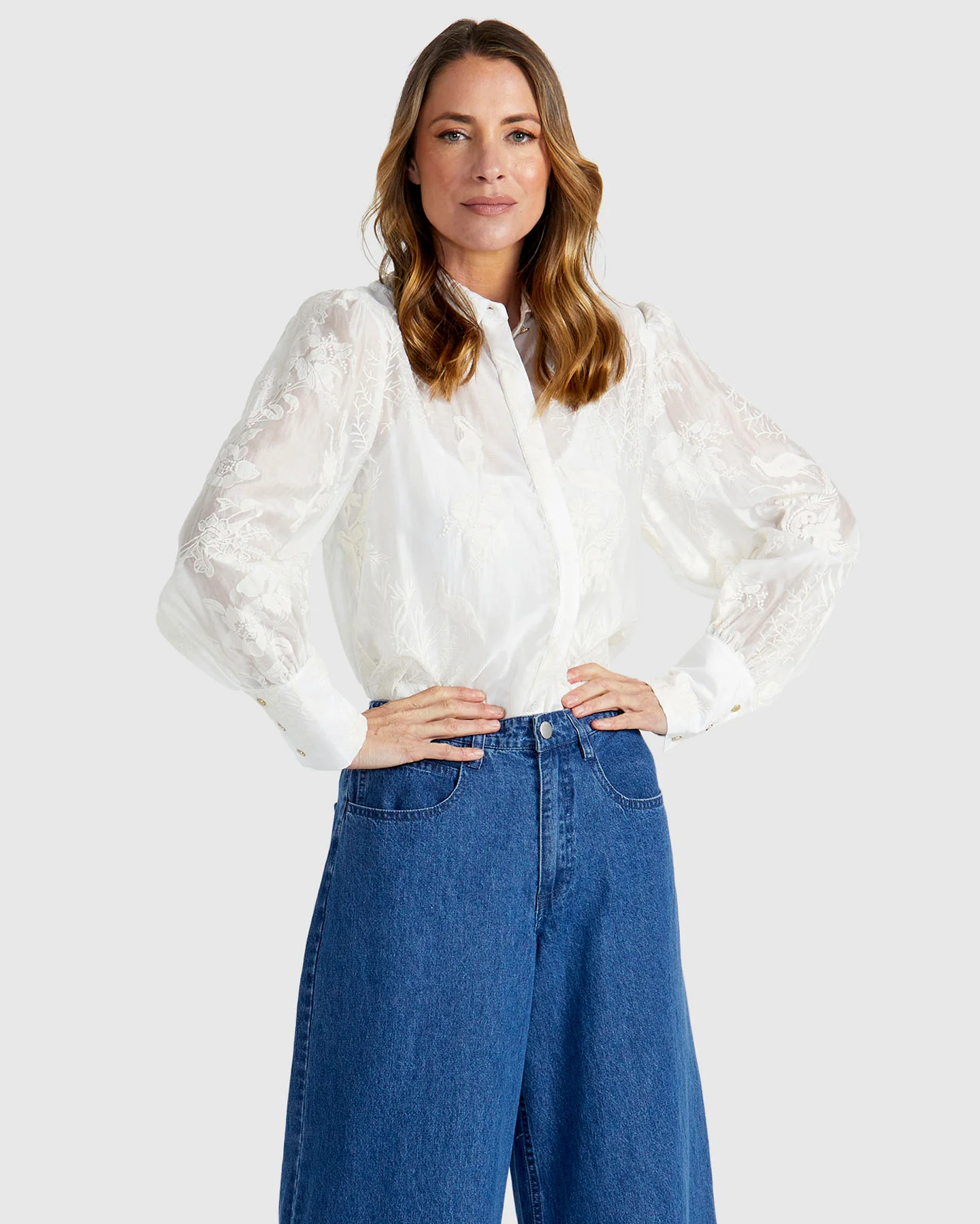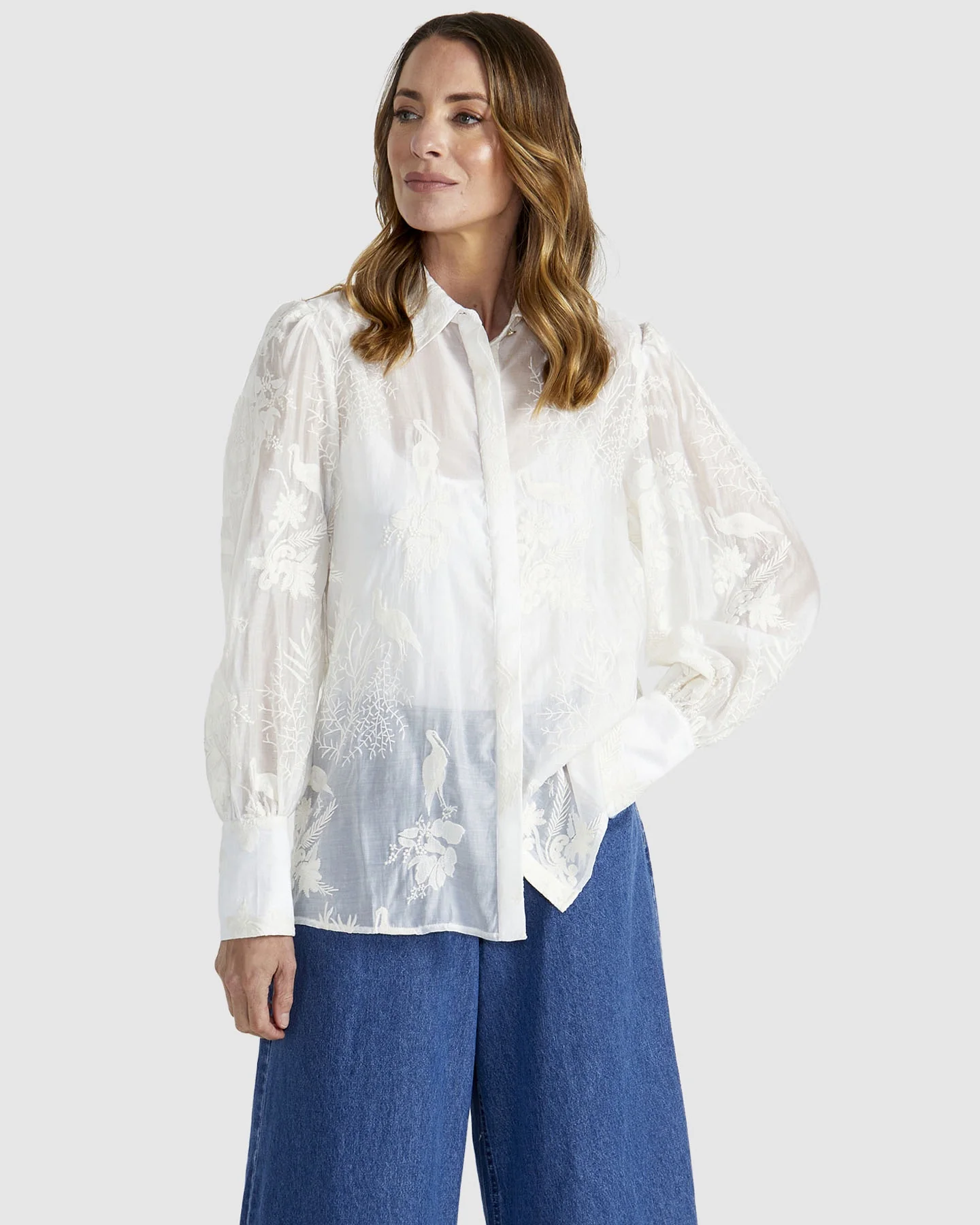 The Aurora Shirt brings an elevated touch to any wardrobe. Featuring stunning crane embroidery and a detachable cami, this piece combines a wide sleeve cuff with long, puffy sleeves. Its concealed placket and relaxed fit create a sophisticated, timeless look for cooler months.