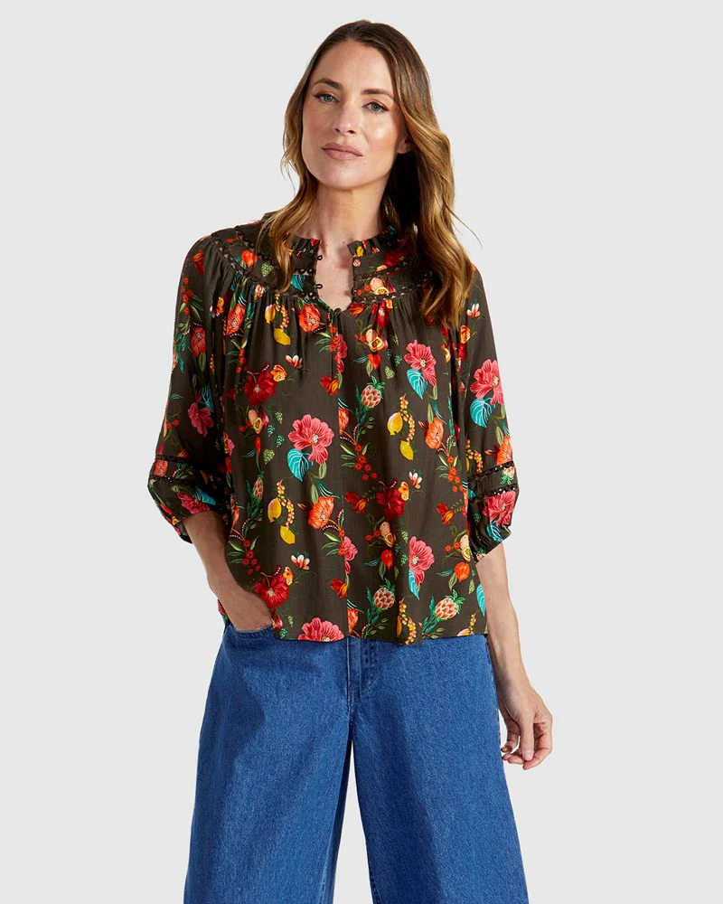 Featuring oversized puff sleeves with ladder trim detail, the Guadalupe Top is a sophisticated, winter-ready piece. A front keyhole opening with button closures and frill detail at the collar elevate its classic design, offering a polished, relaxed fit for the discerning woman.