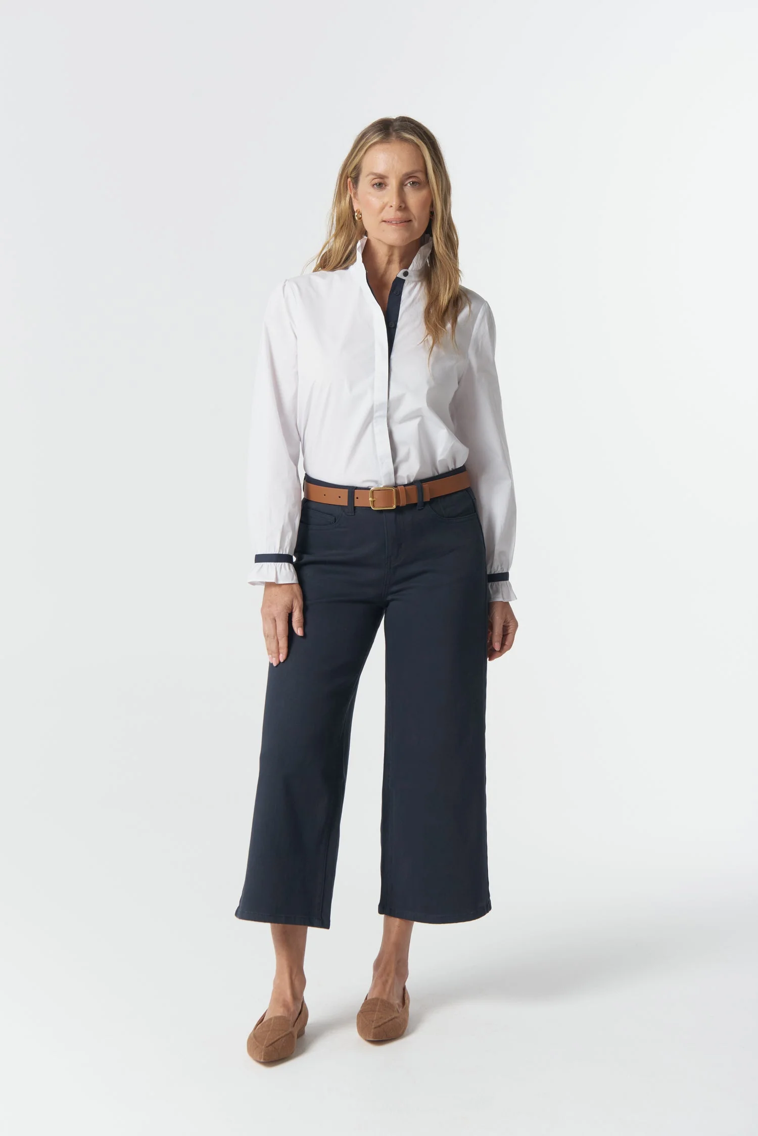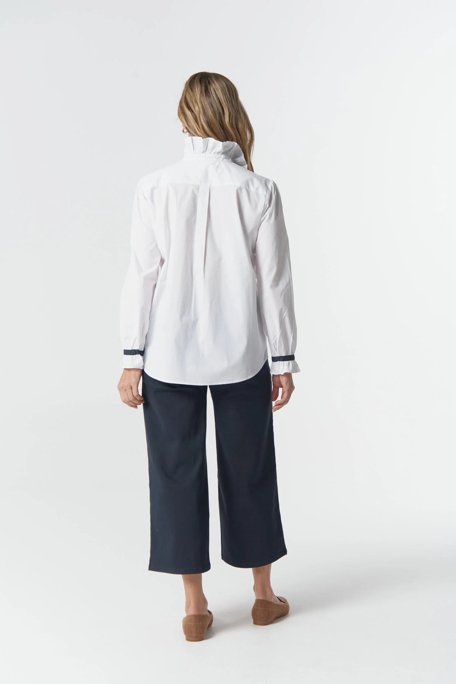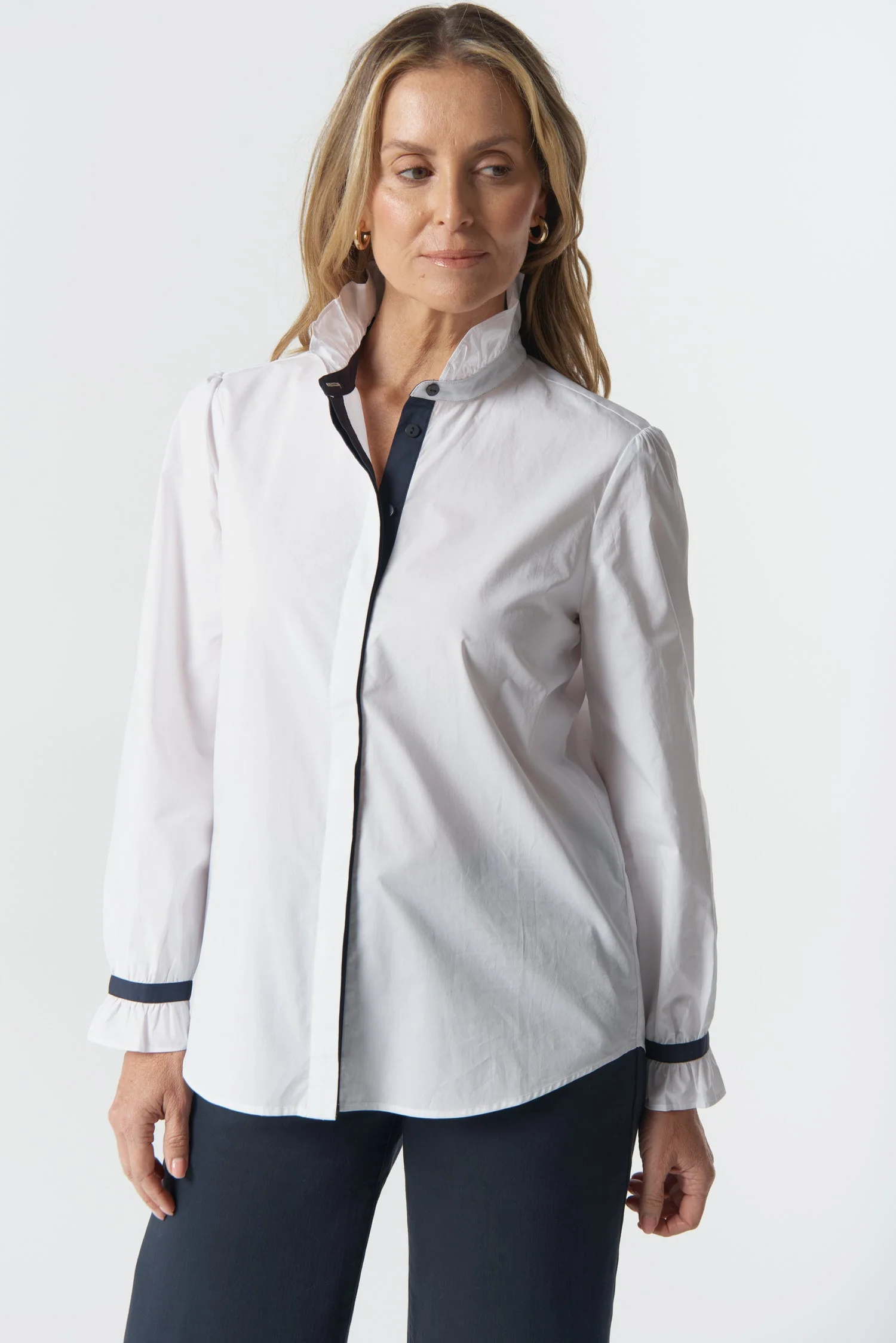 The Sky Frill Neck Cotton Shirt is a fresh take on a classic button-through. Crafted from crisp cotton, it features a soft frill neckline, delicate frill cuffs and a clean, tailored silhouette that feels both effortless and refined. Light and easy to wear, this shirt pairs beautifully with jeans, shorts or skirts — perfect for everyday.