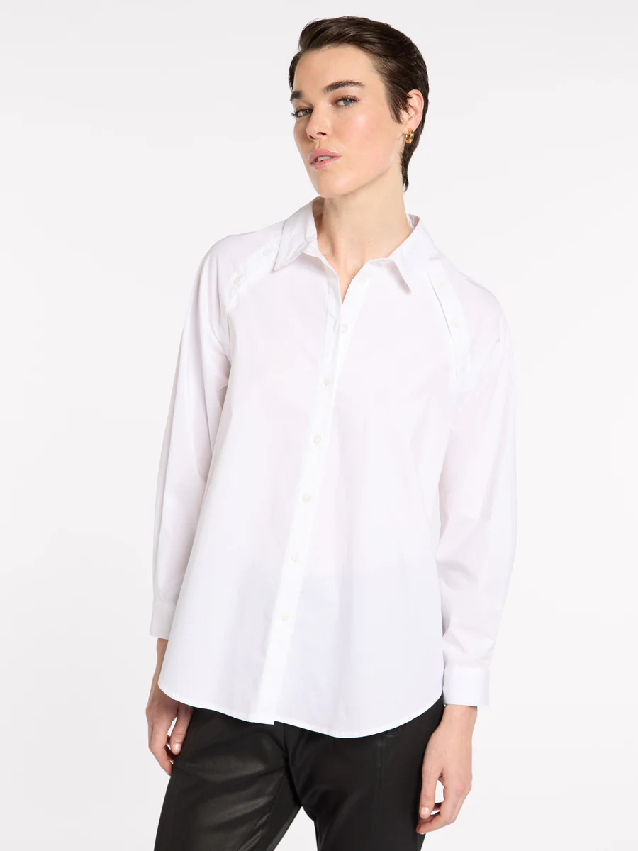 The Essential Button Shirt is a wardrobe staple, crafted from our favourite stretch Cotton Poplin. The button detailing at the body and raglan sleeve seams accentuates the design and adds a practical touch, being fully functional. A perfect update on this season’s crisp white shirt or as a layering piece under our bestselling knit vests and pullovers.